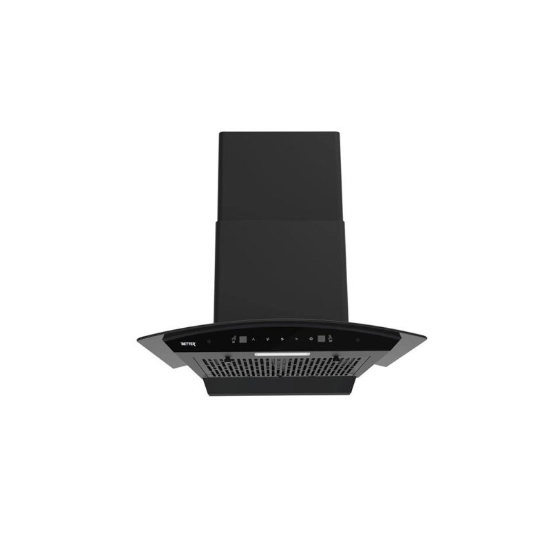 The Better Breath Glasshood Chimney is a beautiful and efficient way to remove smoke and odors from your kitchen. It has a large curved glass hood and a sleek black design.